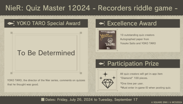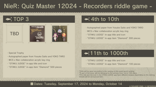 “OTAKU JUDGE NieR QUIZ MASTER12024 - Recorders riddle game -” is an official collaboration event of